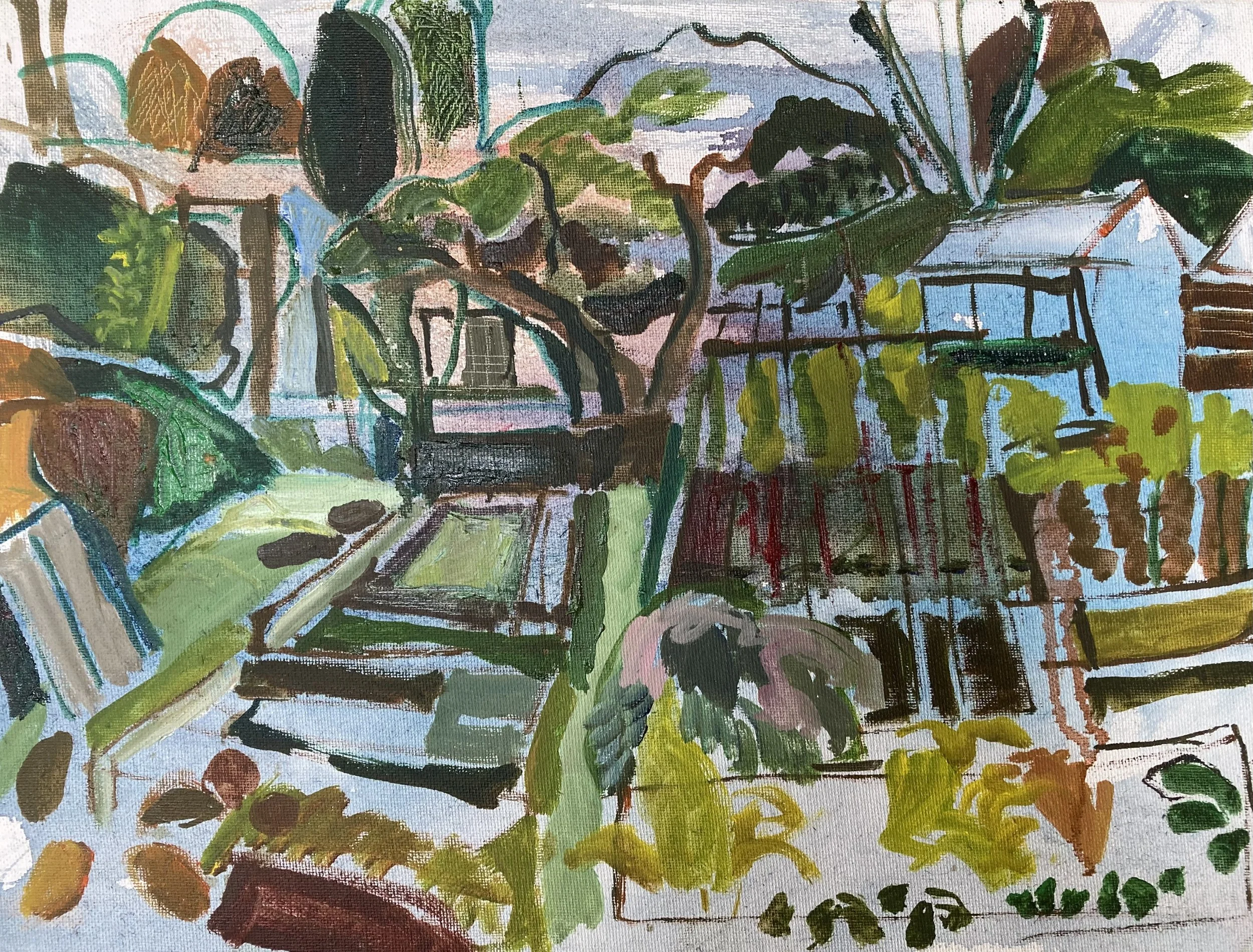 “Sophy Wollaston’s work responds to natural spaces in urban areas. These green spaces hold an importance to her; as a GP she recognises they are essential to our wellbeing. They foster community and are visual representations of positive change. Formally, they provide a contrast to the hard lines and glinting buildings of London. Allotments are a place of interest: the paraphernalia of tumbled-down greenhouses, singular water cans and the structures of vegetable patches create a joyful jumble of pattern which Wollaston abstracts in her work. Her pieces are a riot of colour, as this is what she is naturally drawn to. By painting plein air, she is instinctively responding to how she sees, casting each place with her energetic brushstrokes.”